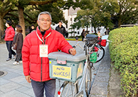 Today, as usual, Mr. Kosei Mito (age 78) stands at the foot of the Atomic Bomb Dome that conveys the disastrousness of the atomic bomb that was dropped on Hiroshima City on August 6, 1945. He comes to the Atomic Bomb Dome and stands in front of it from ten o'clock in the morning to around five o'clock in the afternoon almost every day except for rainy days. It takes him about 40 minutes for to bike to the Atomic Bomb Dome from his home. He has used his fluent English to volunteer to share the reality of the atomic bombing with visitors from Japan and abroad. To date, he has guided over 300,000 people, including about 95,000 visitors from 180 countries.