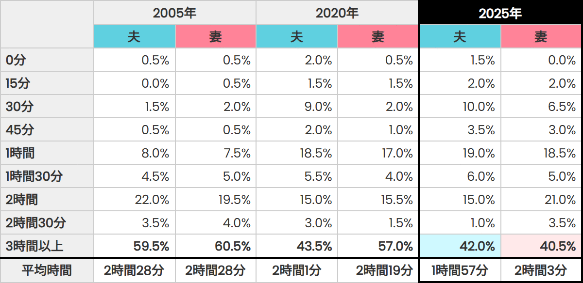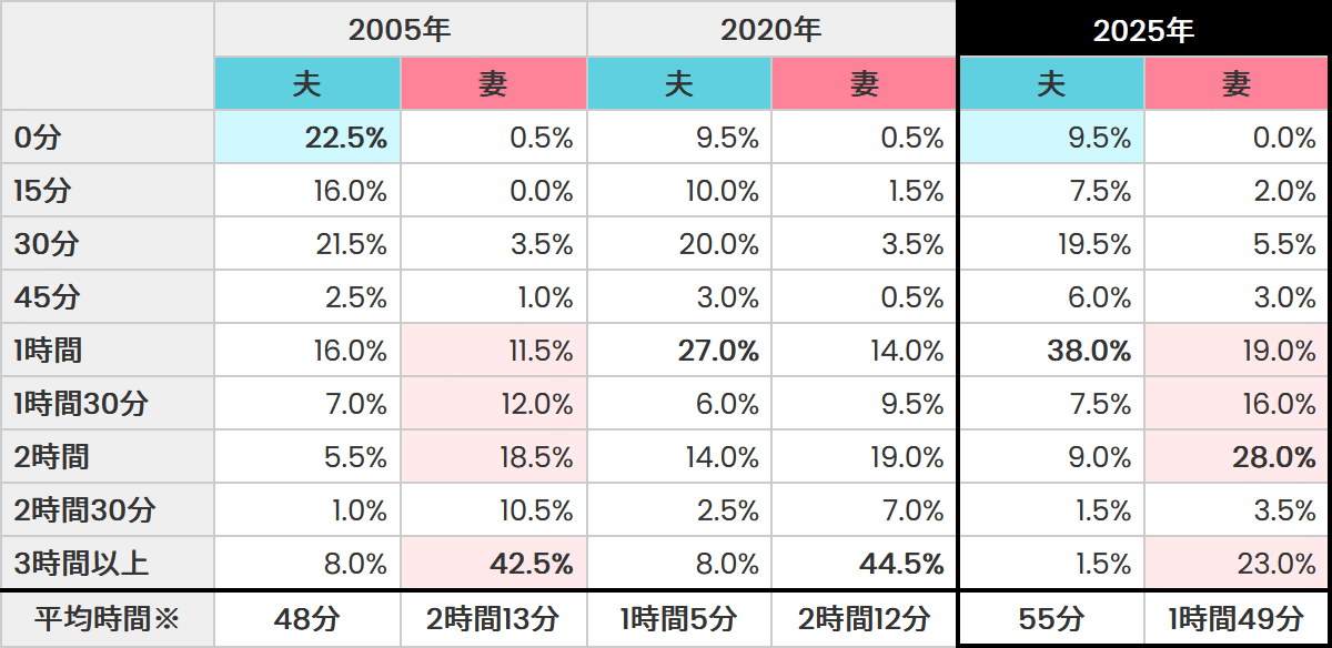「0分」と回答した夫は22.5%から9.5%へと大幅に減少し、"家事ゼロ"層が明確に減りました。一方で、妻の「3時間以上」が42.5%から23.0%へと半減し、「1時間~2時間」層が増加しています。