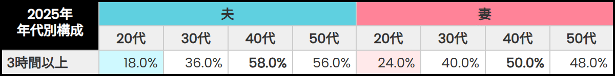 「3時間以上」と回答した割合は、夫42.0%、妻40.5%と高く、特に40~50代では約半数に達しました。一方で、20代では夫18.0%、妻24.0%と低く、若年層ほど夫婦で一緒に過ごす時間を重視する傾向が見られます。