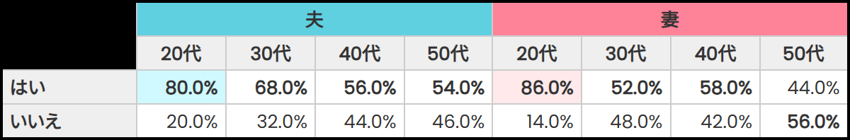 年代が上がるにつれて割合はやや低下するものの、30~50代でも夫の過半数(30代68.0%、40代56.0%、50代54.0%)、妻の約半数(30代52.0%、40代58.0%、50代44.0%)が「はい」と回答しています。世代を問わず、「特別な日はできるだけ一緒に過ごしたい」という意識が広く浸透していることが分かります。