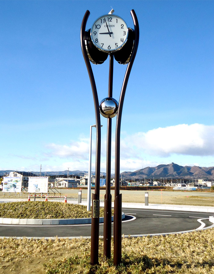 東北相馬工場のあるJR常磐線新地駅は東日本大震災の大津波で駅舎や駅周辺が壊滅的な被害を受けましたが、復興事業で駅付近一帯が4m嵩上げされ、旧駅舎から300m南西側に移設された新駅舎で2016年12月10日に営業再開しました。シチズン時計マニュファクチャリングは、シチズン時計やシチズンTICの協力を得て、駅前ロータリーにモニュメント時計を2017年1月30日寄贈しました。時計塔は高さ5mで時計盤を3面に配し、太陽光発電を用いた電波時計を採用しました。